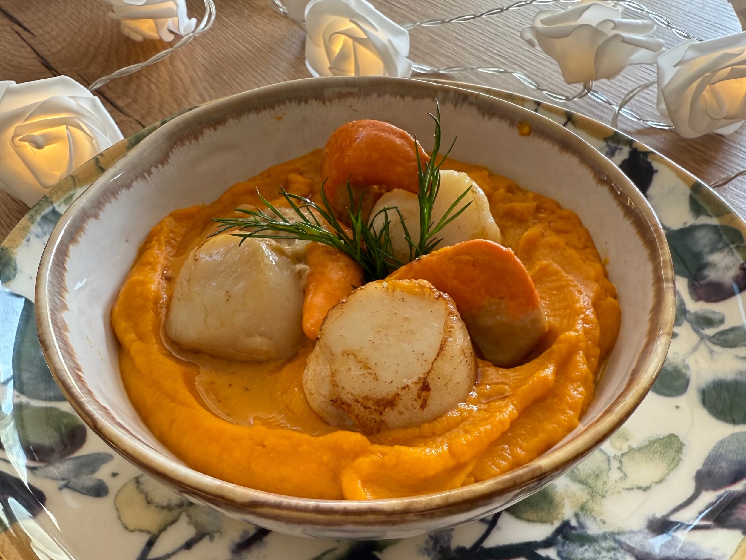 Découvrez un équilibre parfait entre douceur et raffinement avec ce velouté de patates douces, sublimé par des Saint-Jacques poêlées à la perfection.