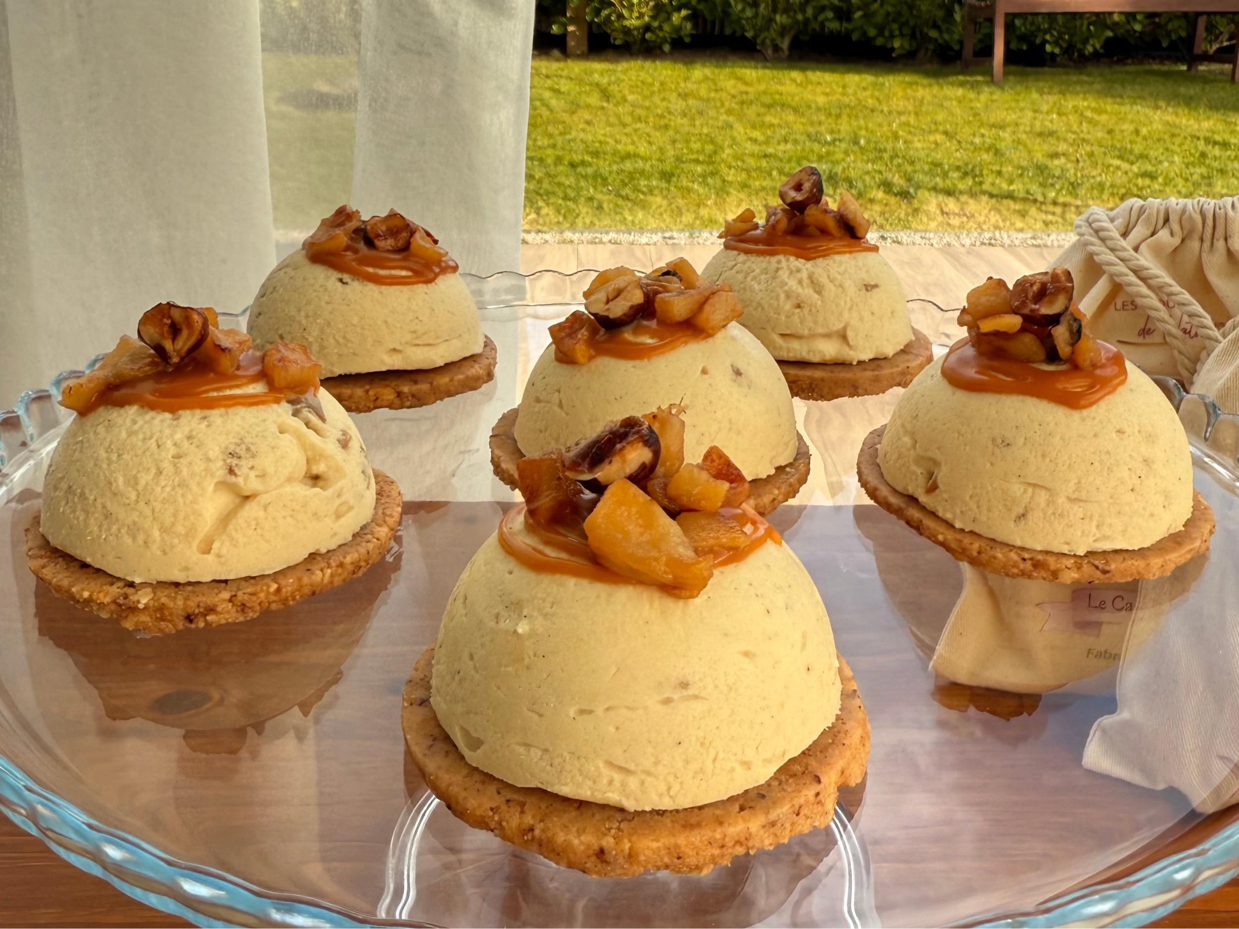 Imaginez des petits sablés normands croustillants, surmontés d'une mousse légère à la compote de pommes au pommeau, garnie de quartiers de pommes poêlées et d'un filet de caramel au beurre salé.